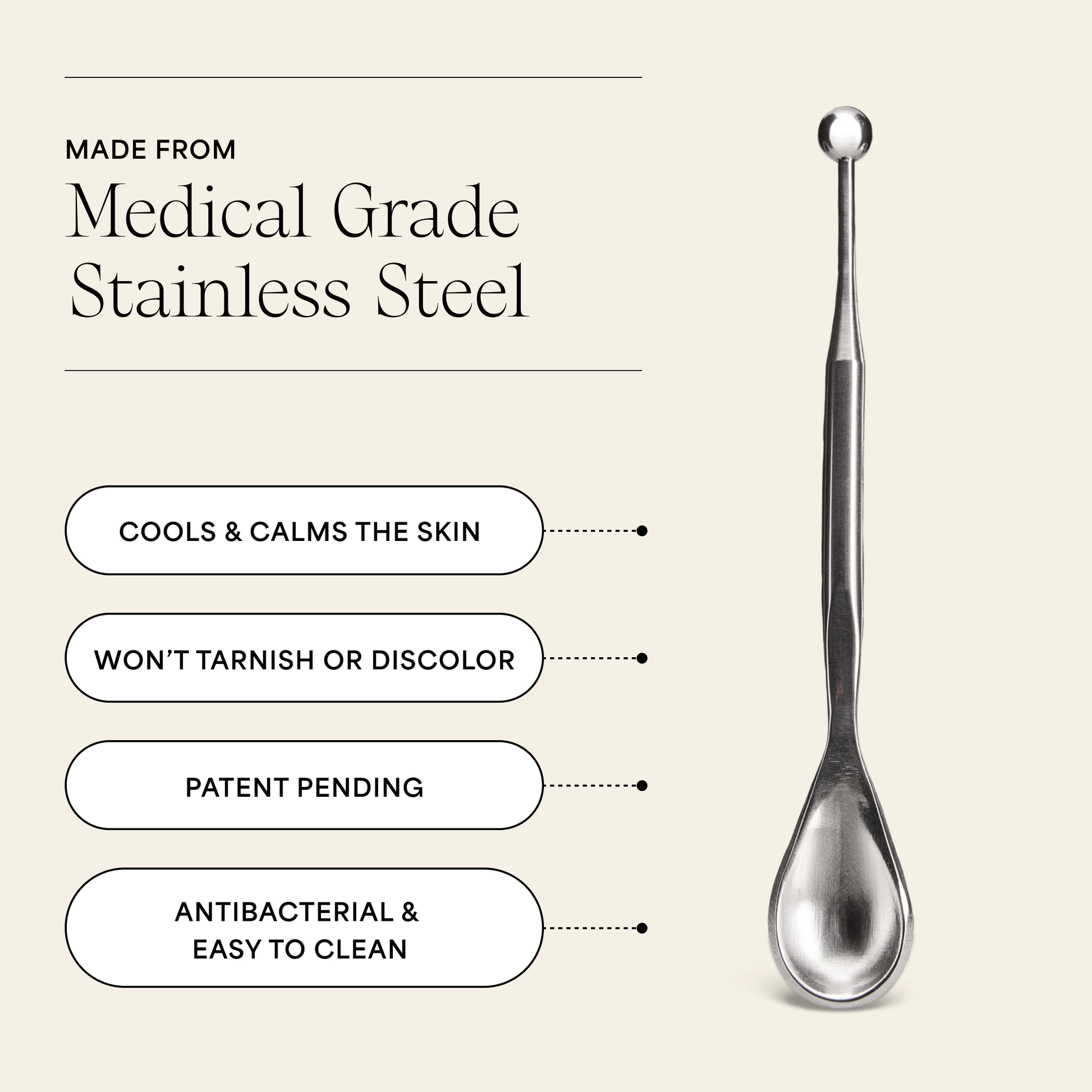 Scoop skincare of choice with the spoon end. Activate points on the face with the reflexology tip. See here for a tutorial.